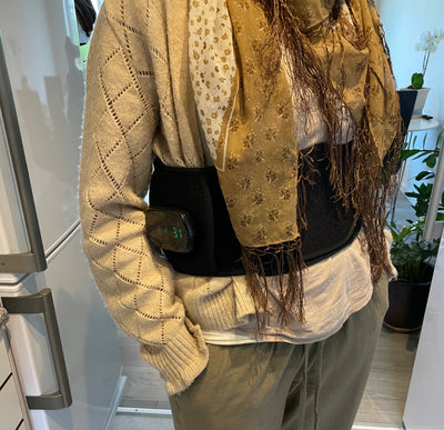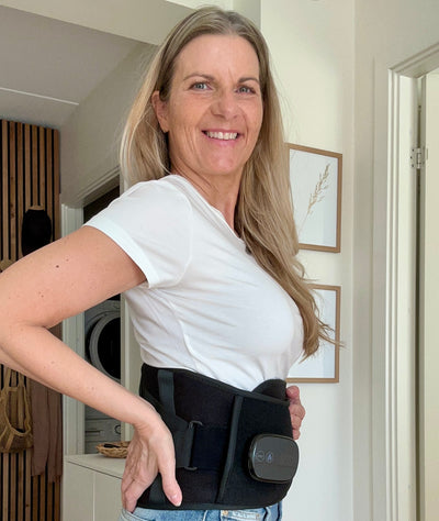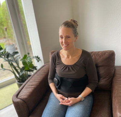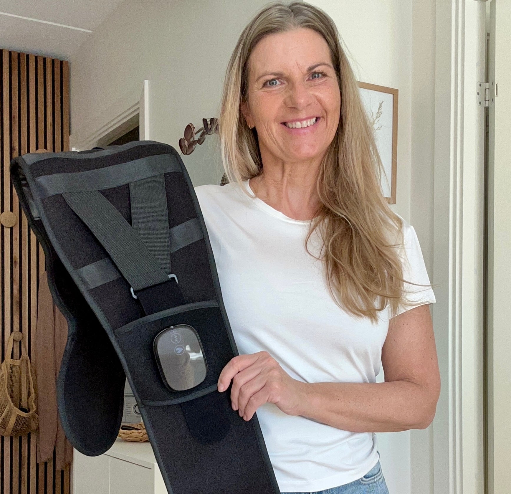 Karina viser hvor nemt det er at bruge varmebæltet™. Du spænder det om kroppen, vælger varme og massage med et tryk – og så gør bæltet resten. Ingen kabler. Ingen besvær. Bare dyb, infrarød lindring, når du har brug for det.